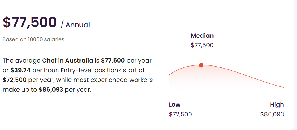 在澳洲主廚平均年薪為$77,500澳幣或平均時薪為$39.74澳幣。若從剛入行起步的主廚年薪平均大概有$72,500澳幣開始,至最資深的主廚年薪可以高達$86,093澳幣呢~