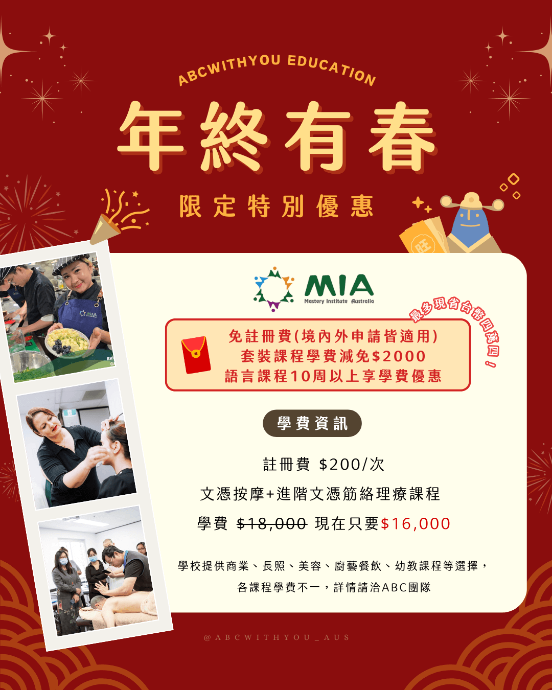 - MIA致力於教育、啟發並賦予學生能力,助他們在選定的領域中取得成功。提供一系列實務操作性強的課程,涵蓋了美容療法、整復按摩以及幼兒教育與照護等多元專業。 MIA 的教學特色在於其高度的實用性,課程內容旨在讓學生畢業後能直接勝任澳洲職場的工作需求,特別注重培養學生的實際操作技能。學院提供小班教學,並由經驗豐富且充滿熱情的培訓師授課,確保每位學生都能獲得個人化的關注與指導。