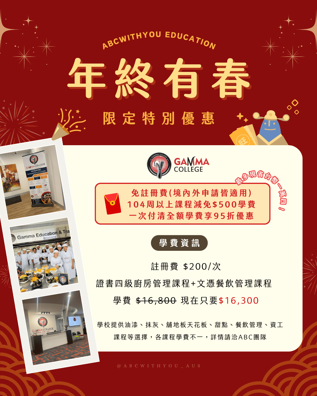 - Gamma College布里斯本、雪梨、墨爾本皆有校區,其中布里斯本校區更是在2021年全新落成的,而且布里斯本校區更提供假日課程,讓學生能彈性安排上課的時間。除了商業課程和IT課程之外,還提供超完善的甜點課程、烹飪廚藝課程、以及 "Master Chef 廚神當道" 培訓養成計畫課程!