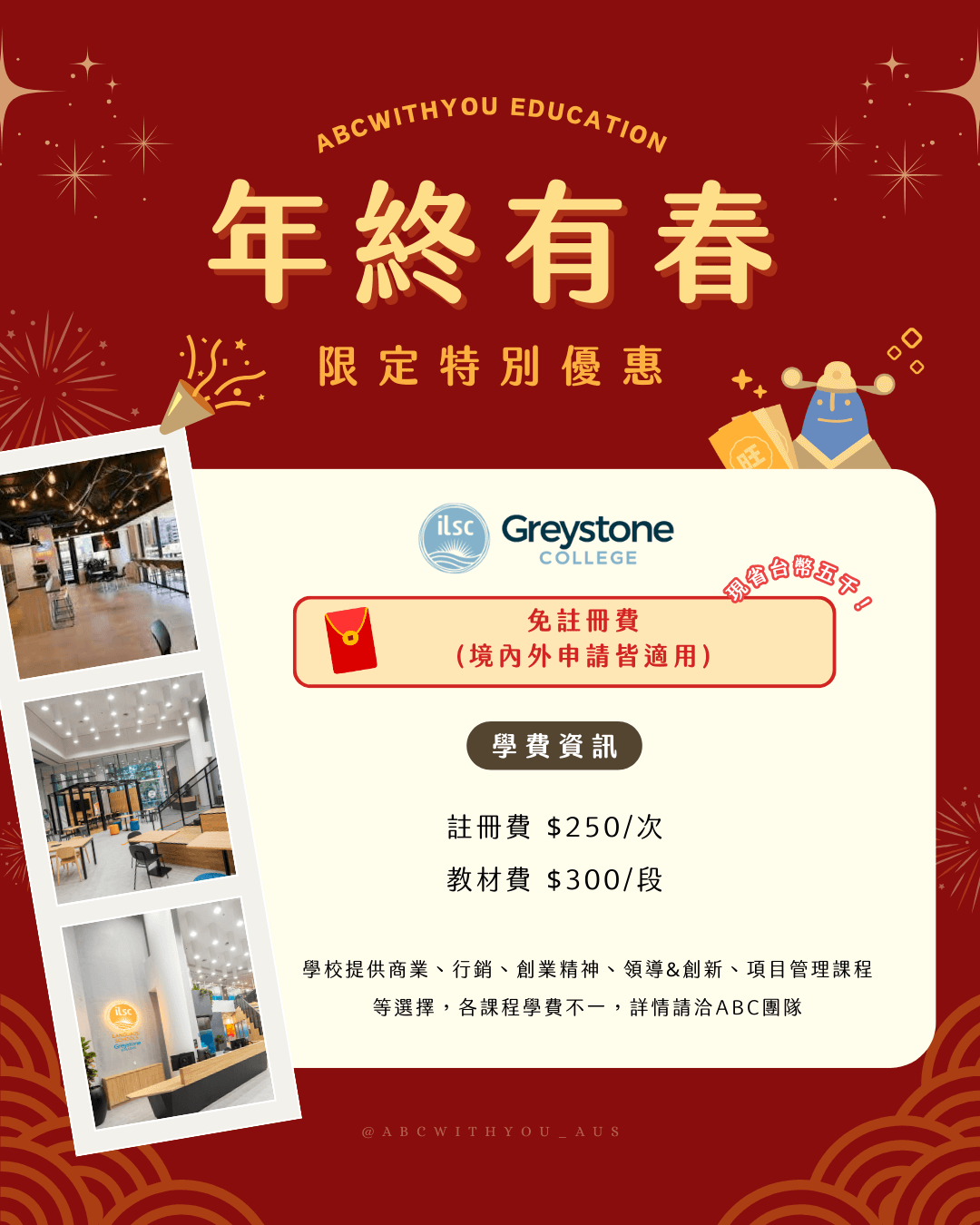 | 證書三級商業課程 Certificate III in Business | 60-66 | 雪梨、墨爾本校區$6,000或$7,000 布里斯本、阿德雷德、柏斯校區$5,600或$6,000 |