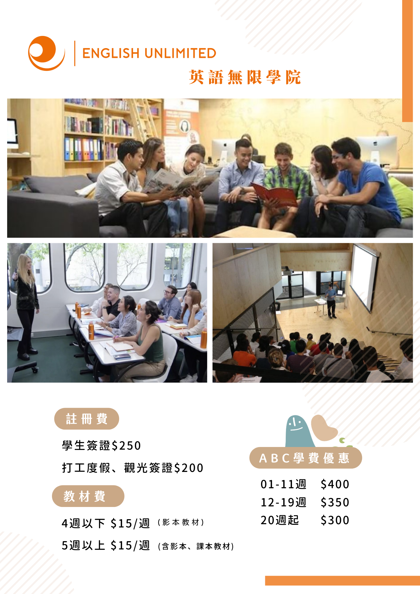 | 一般英語課程 General English | 週 | 原價 $300/週 (優惠價格如下圖DM) |