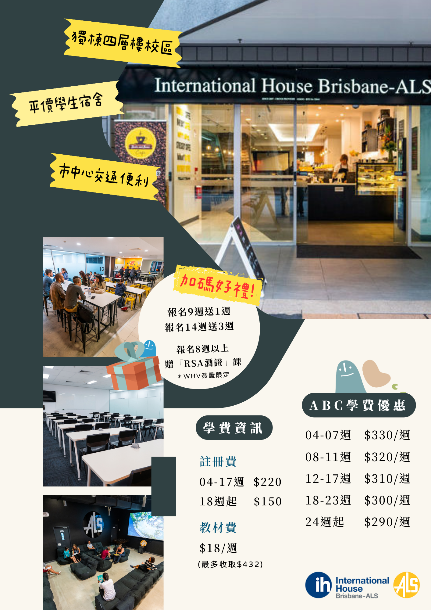 - IH-ALS成立於2007年,在布里斯本市中心擁有全新時尚校園設備,是背包客們心目中性價比(CP值)超高的首選!