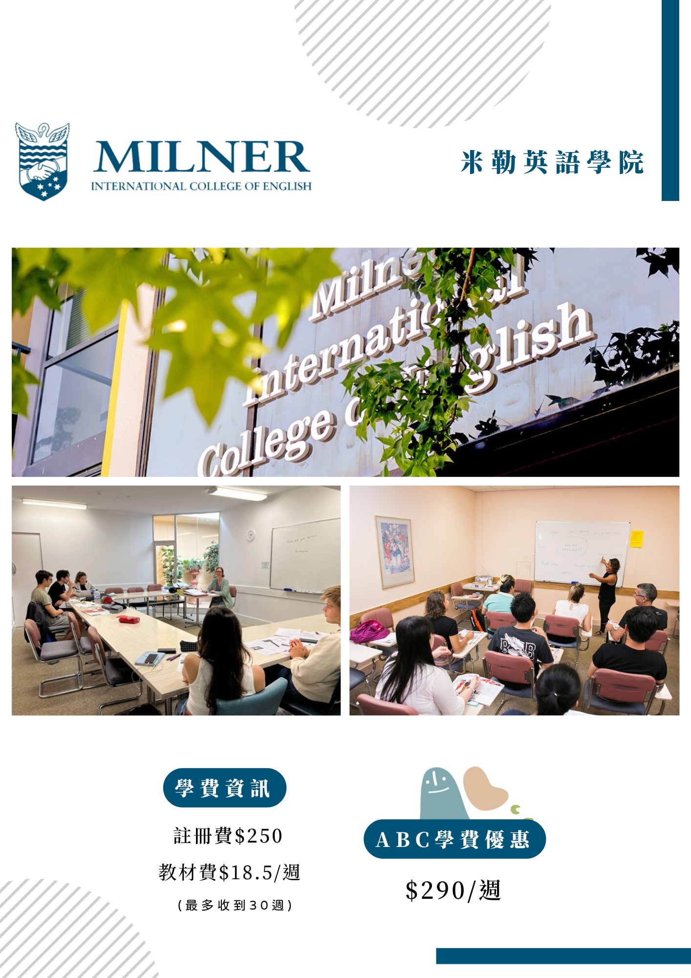 校內圖書館藏書豐富,是學生可善加運用的資源。學生國籍比例上,以歐洲、南美洲佔多數。學校課程設計相當精實,每週以21小時必修課程為主,另提供二堂免費發音課程作為選修。此外,MILNER學生享有免費健身館會員哦!